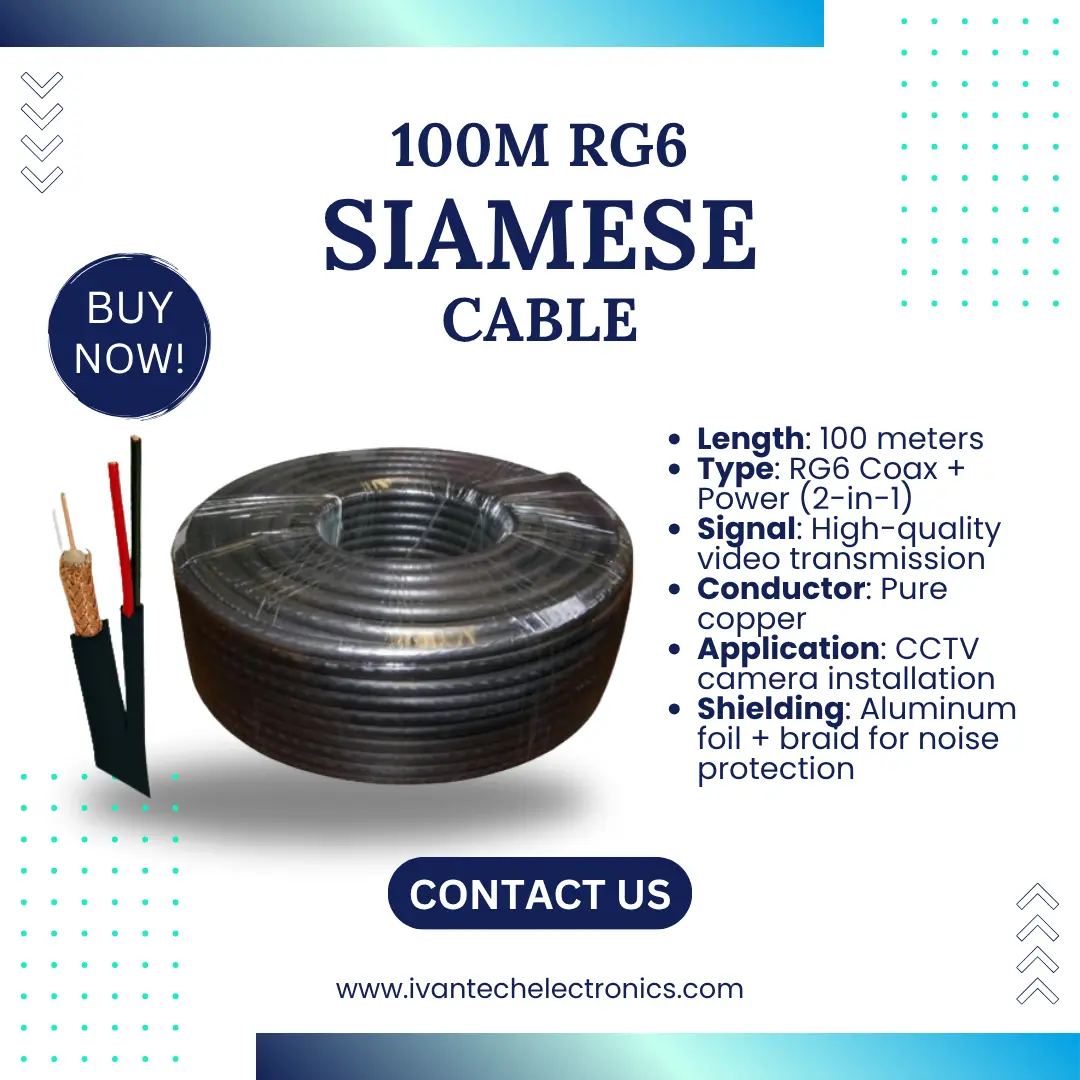 The 100M RG6 Siamese Cable is designed for high-quality video and power transmission in CCTV systems. It combines a coaxial RG6 cable for video and 2-core power cable in one convenient roll, ensuring a neat and reliable installation. Perfect for connecting CCTV cameras to DVRs and power supplies, this cable guarantees minimal signal loss even over long distances.