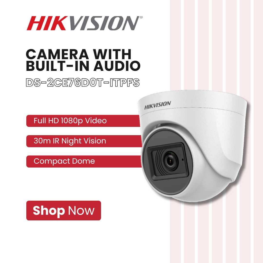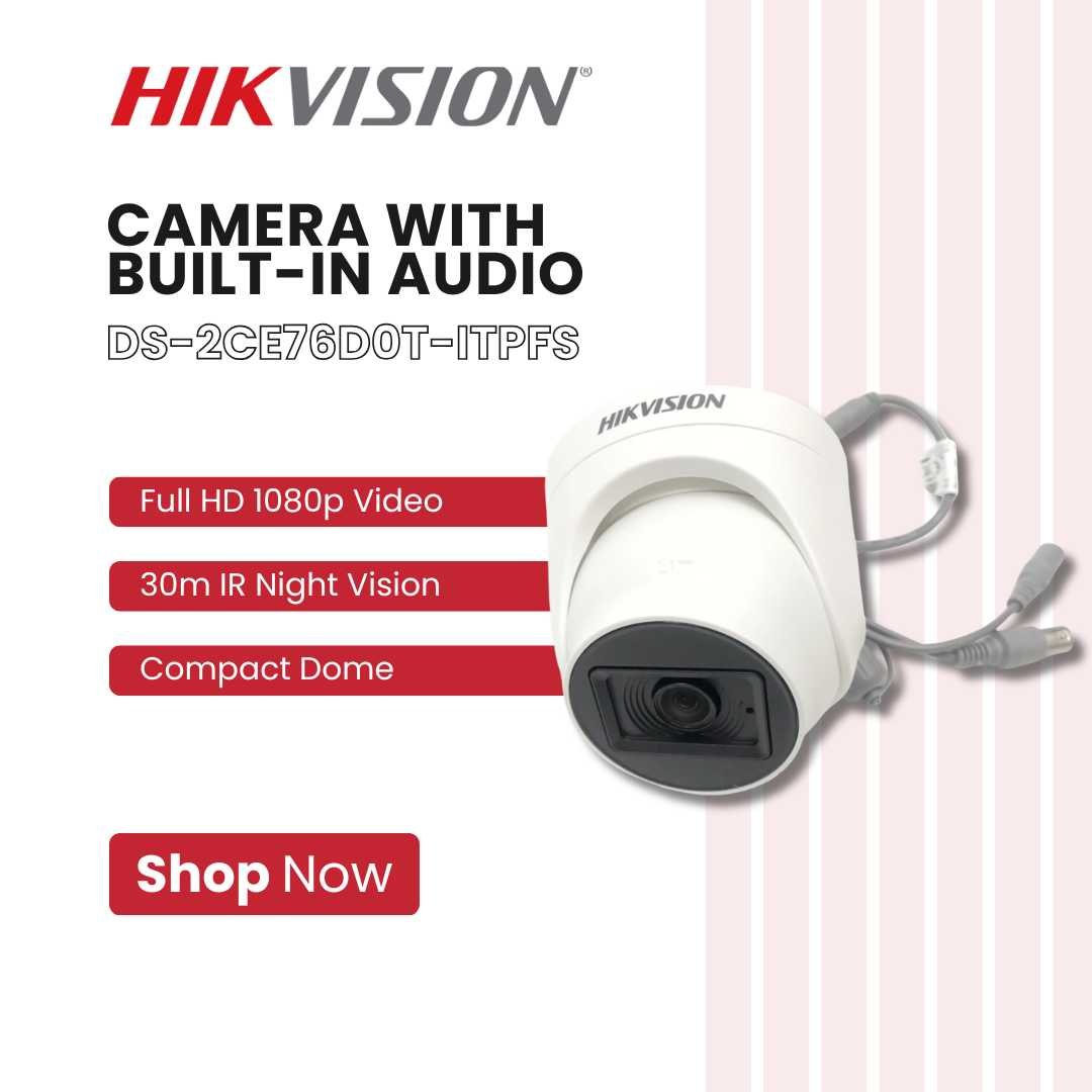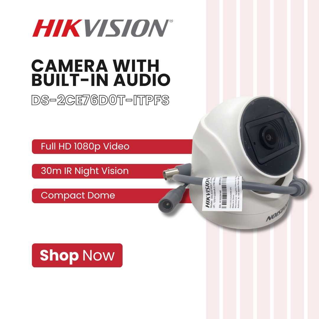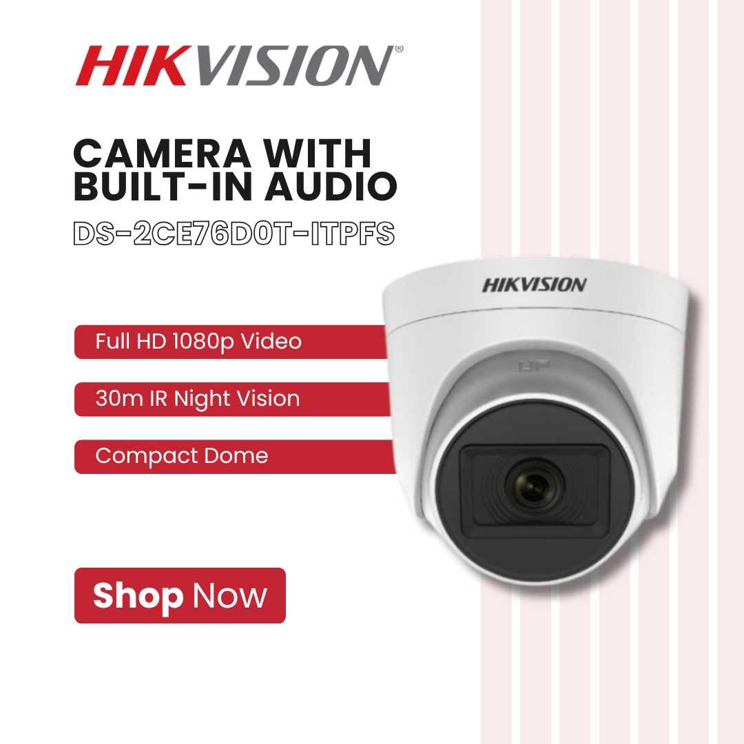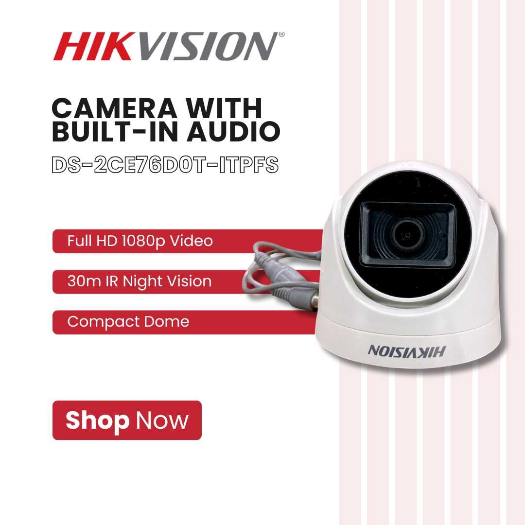 The Hikvision DS-2CE76D0T-ITPFS 2MP Dome Camera with Audio delivers Full HD 1080p video with clear built-in microphone audio recording, giving you both sight and sound for complete surveillance. Designed with a compact dome housing, it blends discreetly into any environment while providing powerful security coverage.